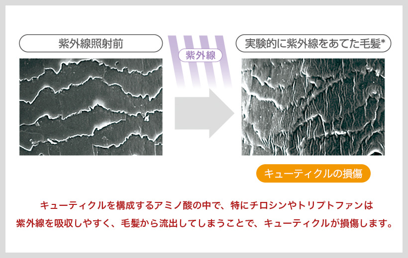髪が紫外線を浴びると、キューティクルが損傷し、酸化ダメージを受けます。これにより、髪の水分保持力が低下し、パサつきや指通りの悪さ、ツヤの低下、ヘアカラーの色あせなどが生じます。特に、チロシンやトリプトファンといったアミノ酸は紫外線を吸収しやすく、これらが流出することでキューティクルが損傷しやすくなります。