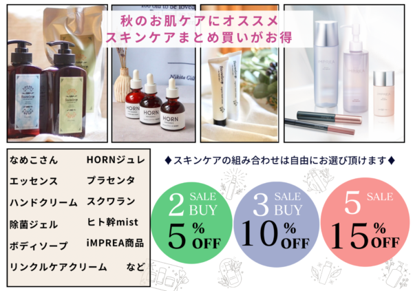 こんにちは、 Snowdropよりお知らせです! 9月キャンペーンとして 【スキンケアまとめ買いキャンペーン】 を 実施します! 季節の変わり目です。 お肌の調子はいかがでしょうか? Snowdrop オリジナルのスキンケア商品や、 美顔器一体型のアイクリーム、 ヒト幹細胞mist、 ミルボンインプレアシリーズなど 充実のスキンケアアイテムが 【まとめ買い】でお買い得になります! お悩み等に合わせてご提案させて頂きます。この機会にぜひ! ご来店お待ちしております(^-^)