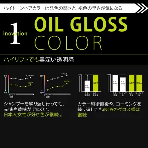 一般的なカラー剤が 水ベース であるのに対して、イノアカラーは 約60%がオイルで構成されているカラー剤 です。