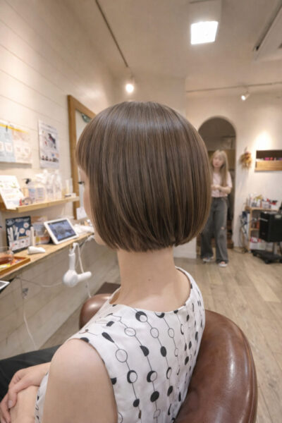 あご下でコンパクトに収まるミニボブは、首元をすっきり見せながらも、丸みを残すことで女性らしい印象に。ラインはきれいに整えつつ、直線的になりすぎないよう調整しているため、ナチュラルで落ち着いた雰囲気に仕上がります。後ろ姿もバランスがよく、横顔や首のラインが美しく見えるのもポイントです。
