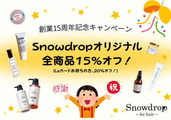 今年の4月は、Snowdropの1店舗目となる阿佐ヶ谷店がオープンしてから15年になります! 創業キャンペーンとして オリジナル商品が15%引きになります! ラグジュアリーカードお持ちの方は20%引きになります! オーガニックシャンプーなどなど とてもお得なキャンペーンになりますのでぜひ!